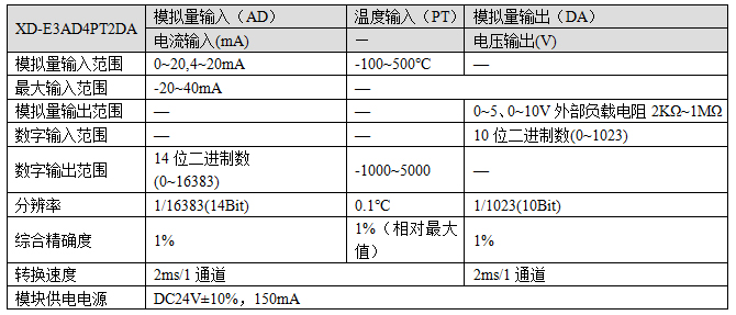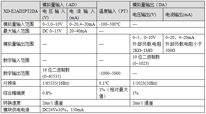 2通道16bit精度模擬量輸入(電流、電壓可選); 2通道PT100溫度輸入; 2通道10bit精度模擬量輸出(電流、電壓可選) |